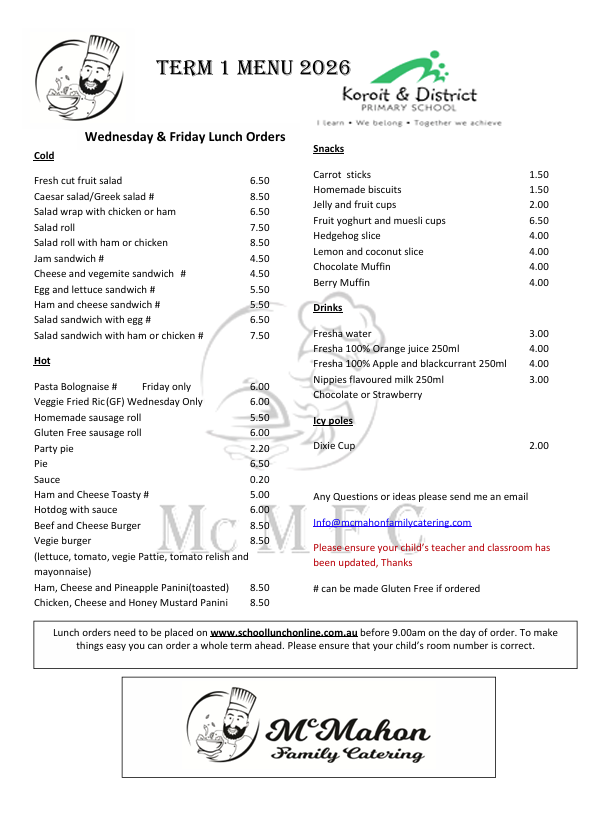KDPS has partnered with McMahon’s Catering and ‘School Lunch Online’ to bring you lunch orders on Wednesday and Friday.